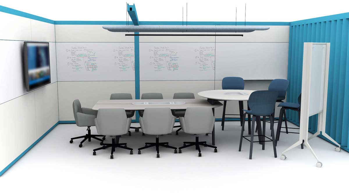 For private meetings, we designed a huddle room, complete with a Buzzi Light and a wall-to-wall marker board, perfect for brainstorming sessions or confidential meetings.