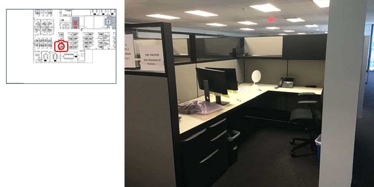 To ensure a smooth move, the Unisource team, led by Ken MacClure, devised a simple and effective strategy — an easy-to-track identification and labeling system, divided into two phases, executed over two weeks. Working off a basic move list, each cubicle was given a unique move number which was inputted into the current floor plan drawing using PlanGrid, a collaborative construction management software app. The team transposed that number in the physical space by placing a sign at each work area. In addition to the move number, the sign also included the employee name, the type of work space, ie. cubicle, and the project phase. Furthermore, Unisource packed all product from copy centers, storage and break rooms. Everything was boxed, secured, and palletized, and then organized into groups for both storage and redeployment.