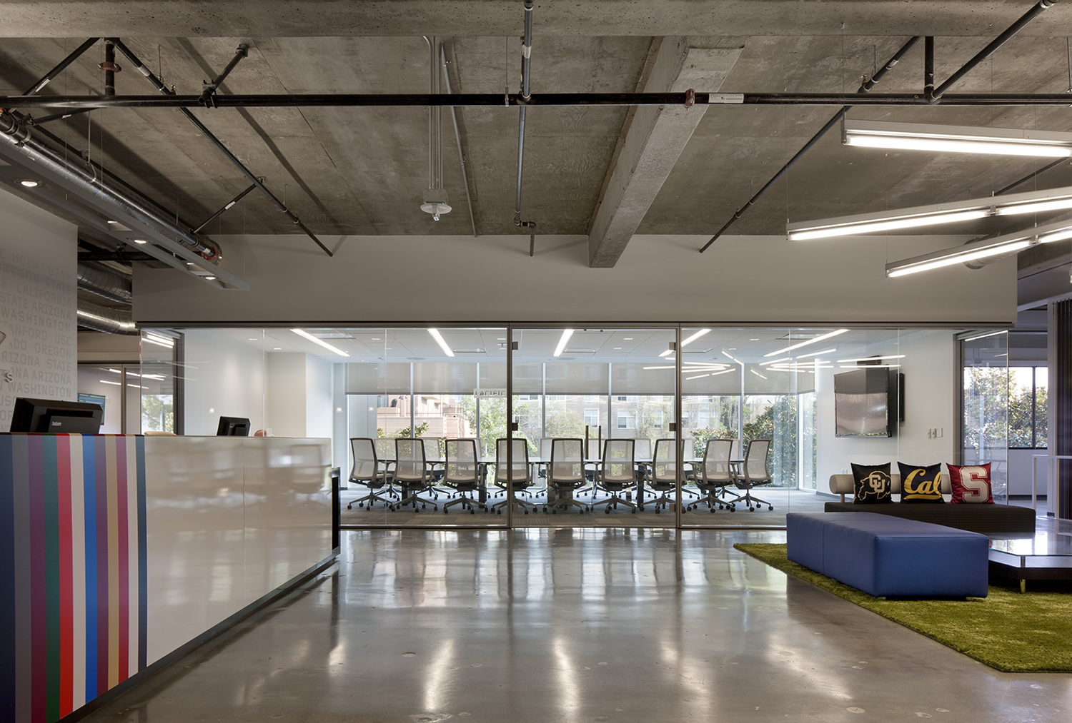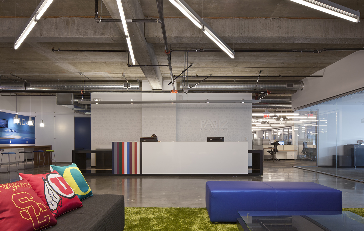 After studying Pac-12’s workflow and management style, our team focused on the drive behind the company — the 12 universities they represent. In order to pay homage to the members, we integrated their colors into work areas and included color banding on the lobby desk. We specified modern workstations and furnishings that represent elements of the company brand.